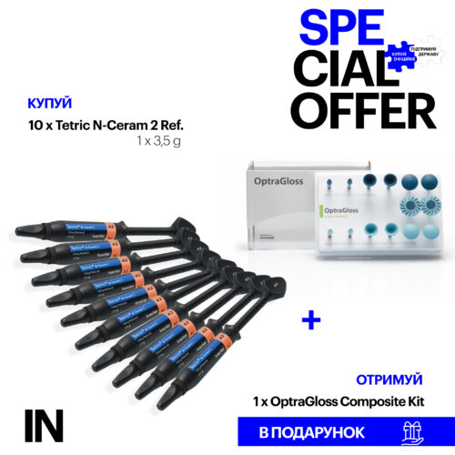 При купівлі  10 х Tetric N-Ceram 2 Ref. 1×3,5g, any shade в подарунок  [073-1705] 1 х OptraGloss Composite Kit