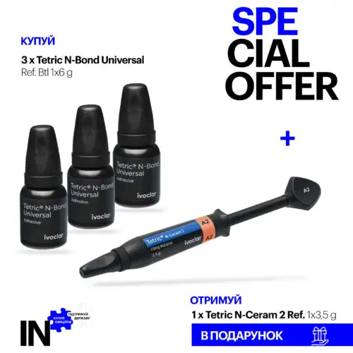 При купівлі 3хTetric N-Bond Universal Ref. Btl 1×6 g в подарунок 1хTetric N-Ceram 2 Ref. 1×3,5g, any shade